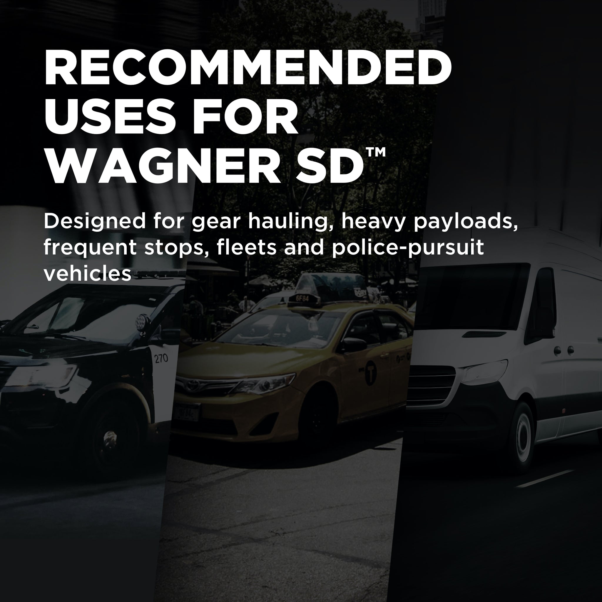 Wagner® SD™ brake pads are specifically designed and tested to provide durable performance for fleets, police-pursuit and vehicles driven in demanding conditions such as frequent stopping, gear hauling and heavy loads.
